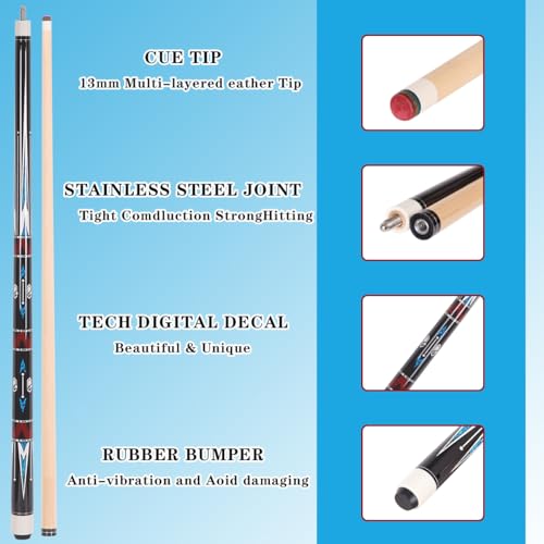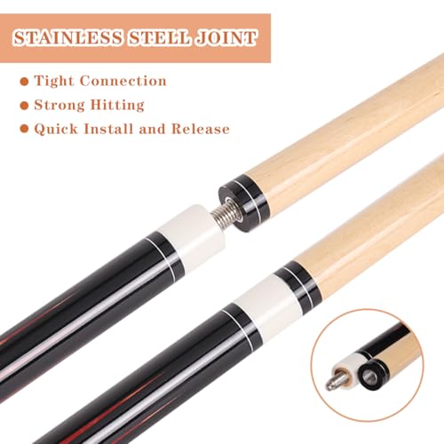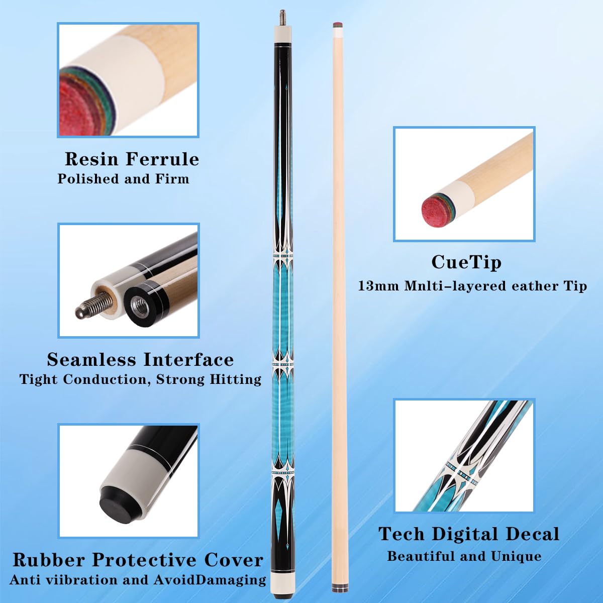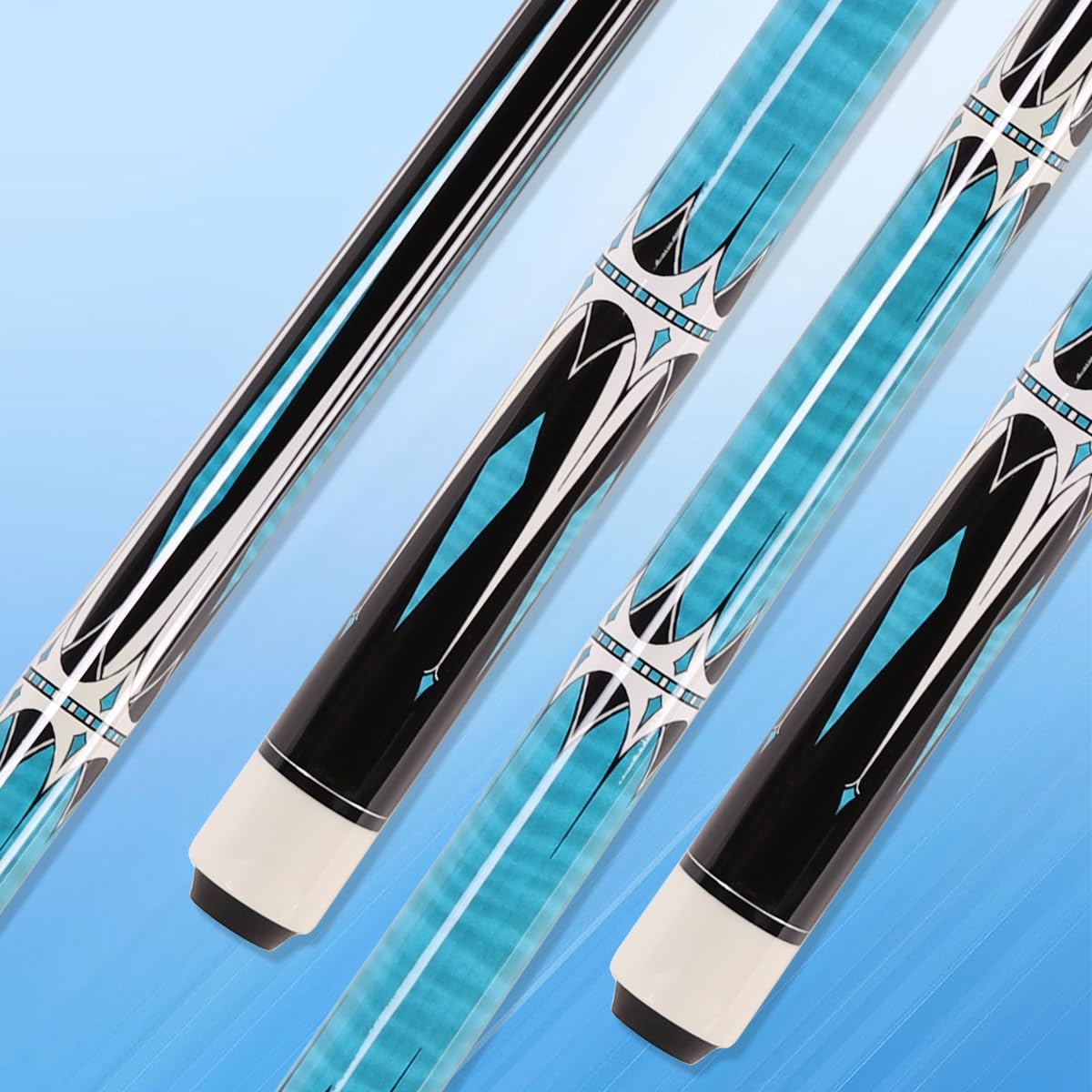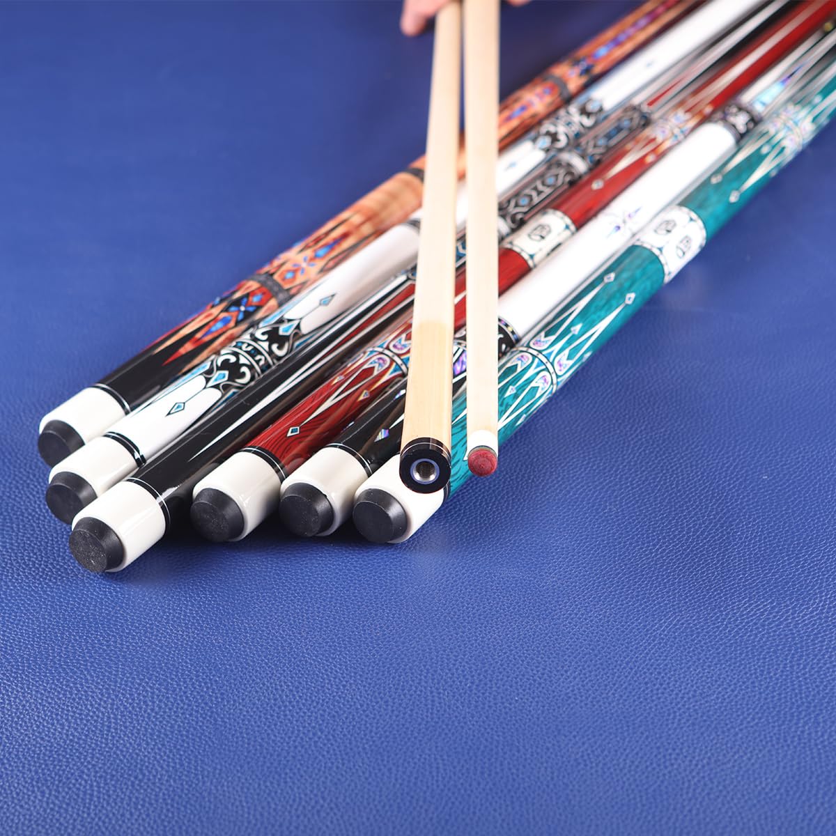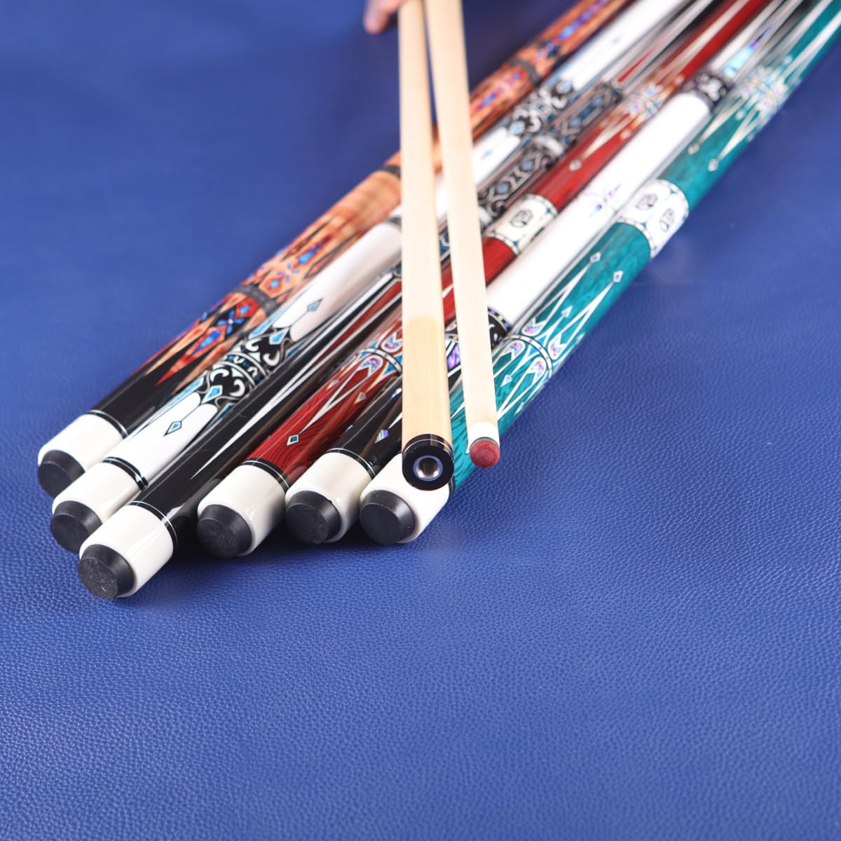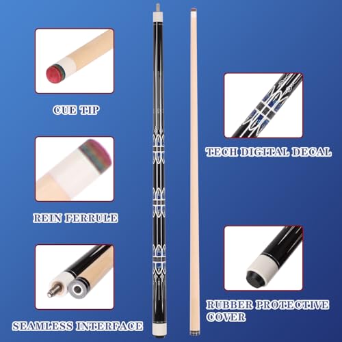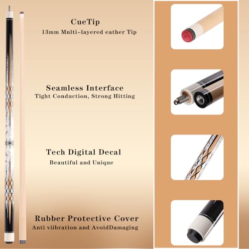 - MAPLE WOOD MATERIAL:Our cue made of hand-selected quality Canadian maple wood, and then overlaid with a beautiful graphic and coated with multi-layers of varnish that protects the cue from moisture and warping. We ensure that the cue stick is 100% straight.