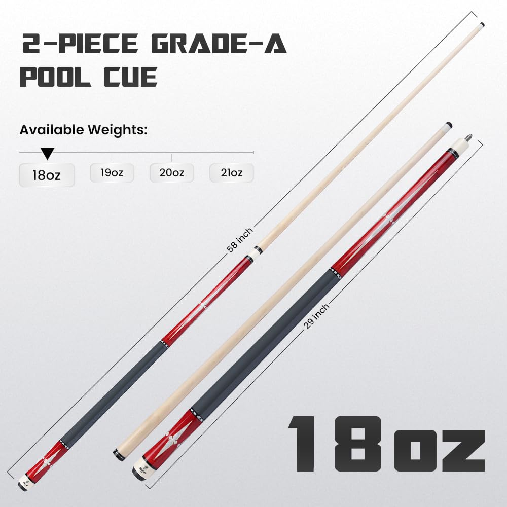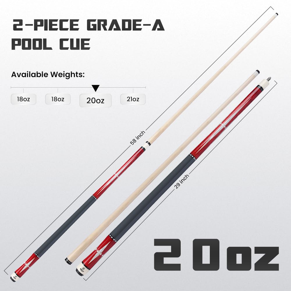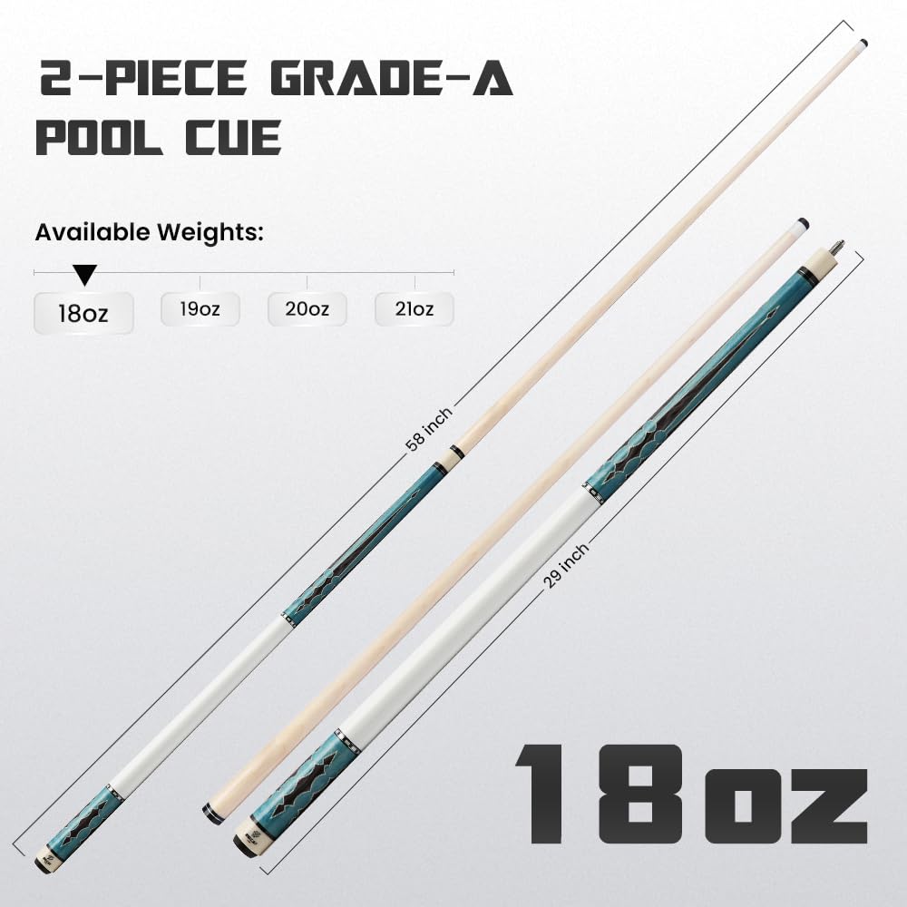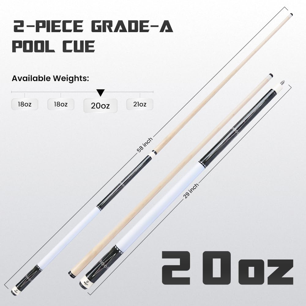 - PROFESSIONAL FEEL & BALANCE: Play like a pro with a perfectly balanced cue. Available in 18oz, 19oz, 20oz, and 21oz, with a 12.5mm professional leather tip and a standard 58ā length, these high-quality pool cues are precision-balanced to suit players of all skill levels.