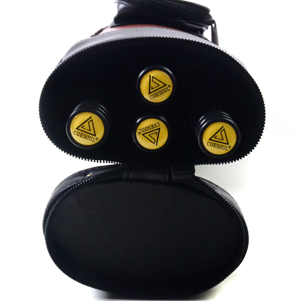 - The Brown Cue Case Holds 2 butts and 2 shafts with Adjustable shoulder strap and handle on pool case,Interior length to fit up to 30" length butt or shaft.(2 Pockets to Hold the Billiards Chalk,Cue Clean Towel,Billiard Accessories)