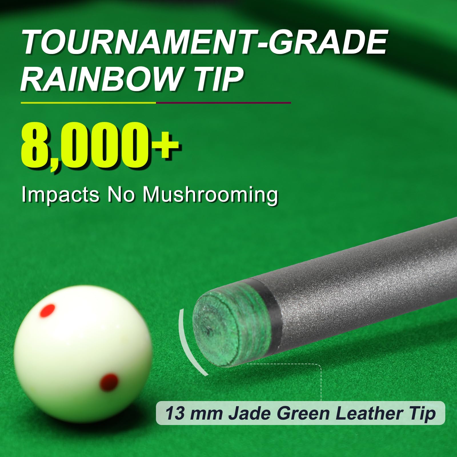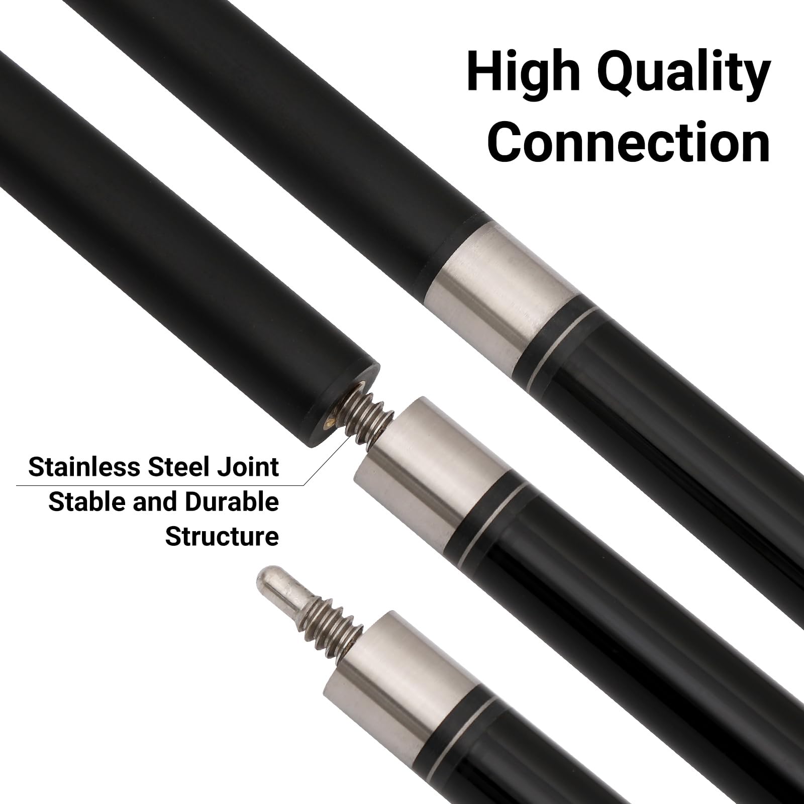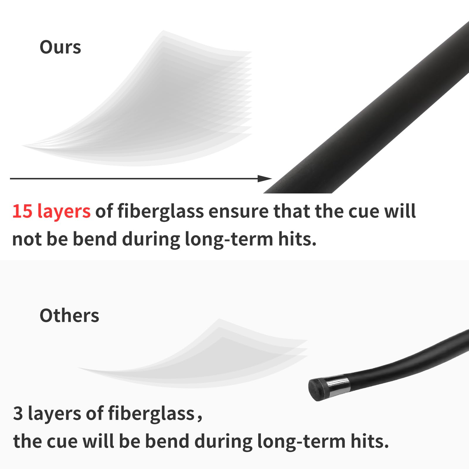 - Material: The pool cue is crafted with 15 layers of high-strength fiberglass composite material, combined with cutting-edge technology; This cue stick offers exceptional resistance to deflection and durability against daily wear and tear