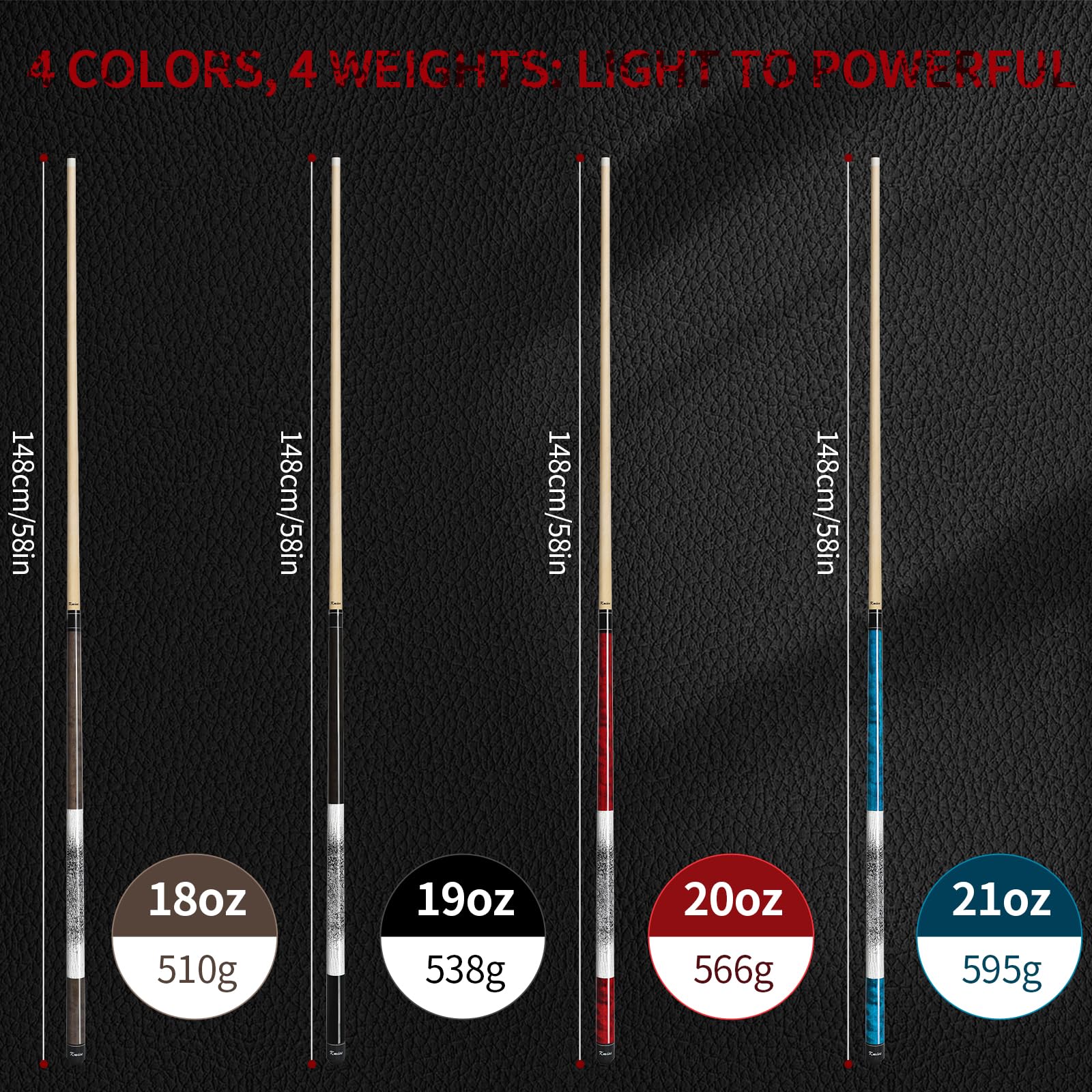 - 4-Weight Precision Matched Set: Brown(18oz)/Black(19oz)/Burgundy(20oz)/Blue(21oz) – each calibrated for unique play styles. CNC-balanced harmony between components. The ultimate pool sticks set of 4