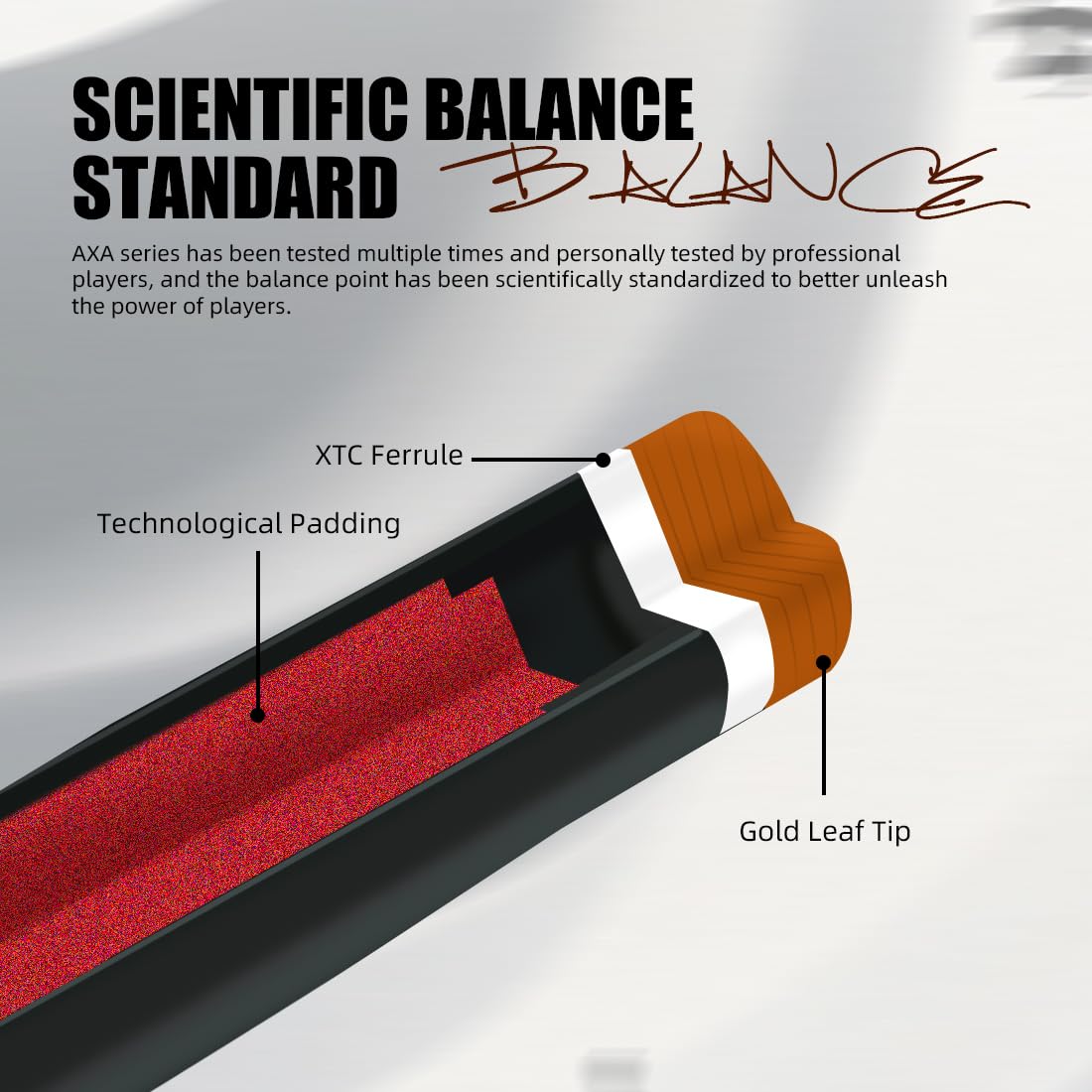 - [High-strength carbon fiber]: The cross carbon fiber technology forelimb of the AXA series pool cues is made of carbon fiber composite materials with low deflection performance, and built-in shock-absorbing foam accessories, which not only makes the back handle power transmission efficient and lossless, but also effectively reduces the deviation when hitting the ball with high rotation, thereby achieving precise control and smooth and stable hitting experience.