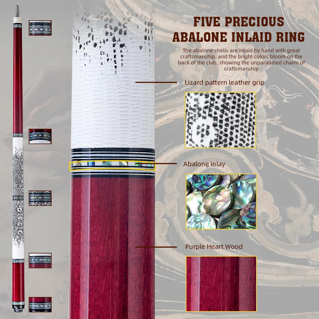 - [Exquisite craftsmanship, luxurious choice]Selected 6 precious abalone inlaid rings, after ingenious hand-inlaid, blooming brilliantly on the butt of the pool cue, showing the unparalleled charm of craftsmanship. The forearm and sleeve are made of extremely hard ebony,deep and rich in texture, not only exuding a high-end atmosphere but also revealing an elegant charm. The grip is made of top-grade lizard-patterned cowhide, with three-dimensional texture, wear-resistant and durable.