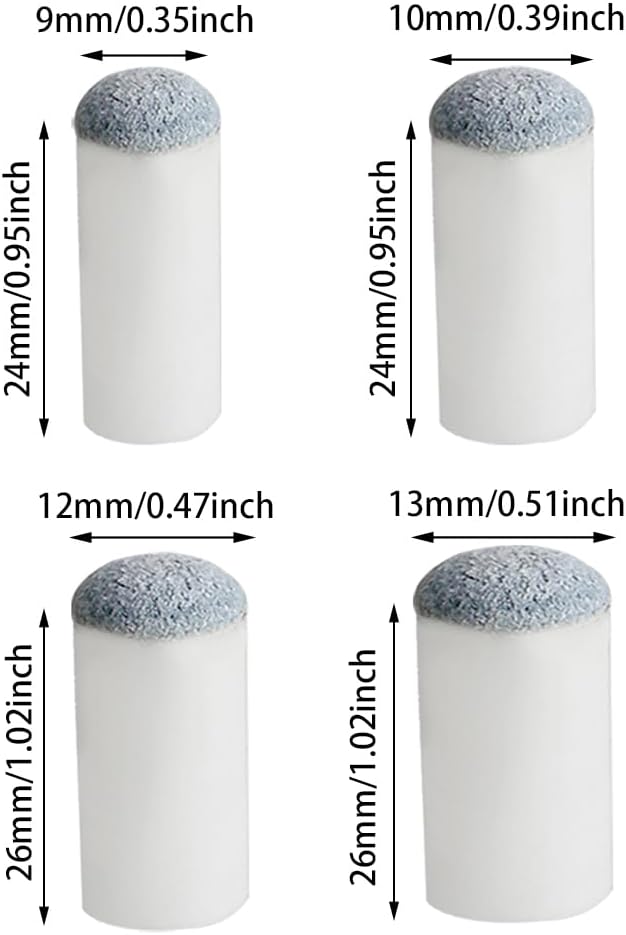 - SIZE - Length of cue tip replacement is approx. 3 cm, 4 different diameter is 9mm, 10mm, 12mm, 13mm