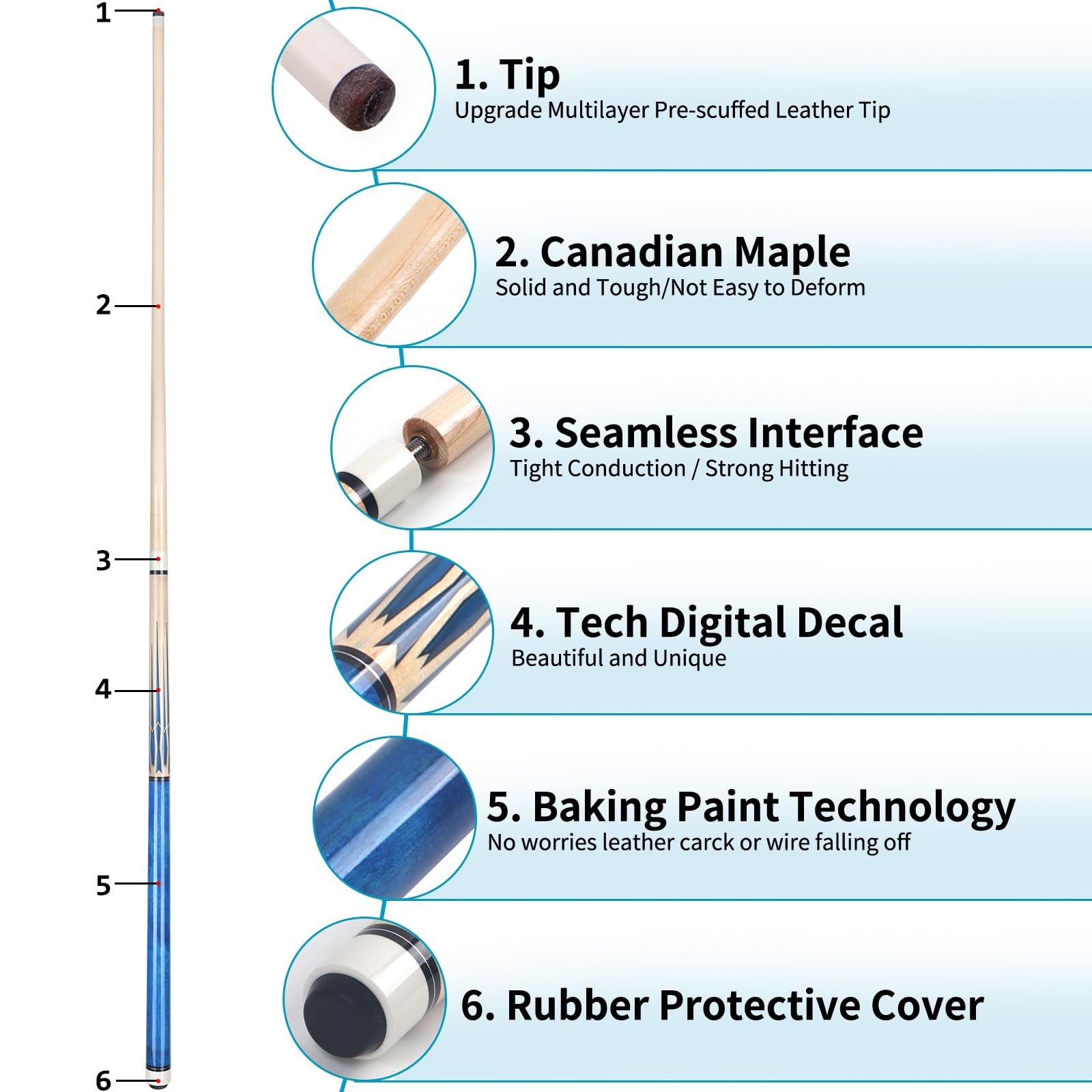 - Technogy: The Pool stick adopt optimized lightning maple and high-quality black metal nano baking paint technology.You do not worry about the leather crack or thred falling off