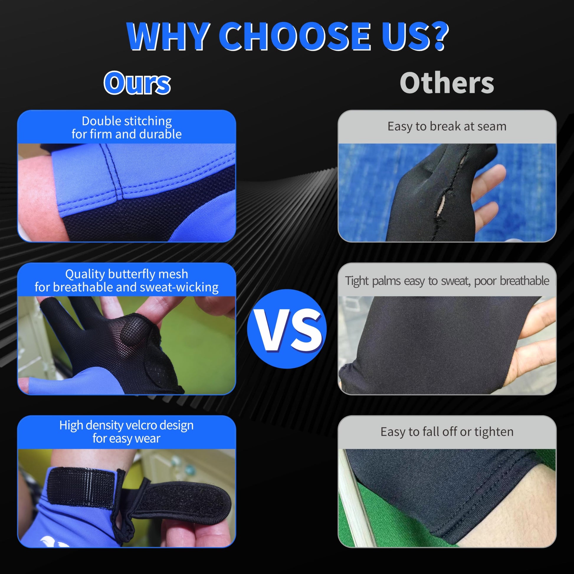 - 【High Quality Materials】High resilience lycra fabric is used on the back of pool glove to make your shot smoother. The palm is made of butterfly mesh fabric, which breathes and sweats, making you more comfortable.