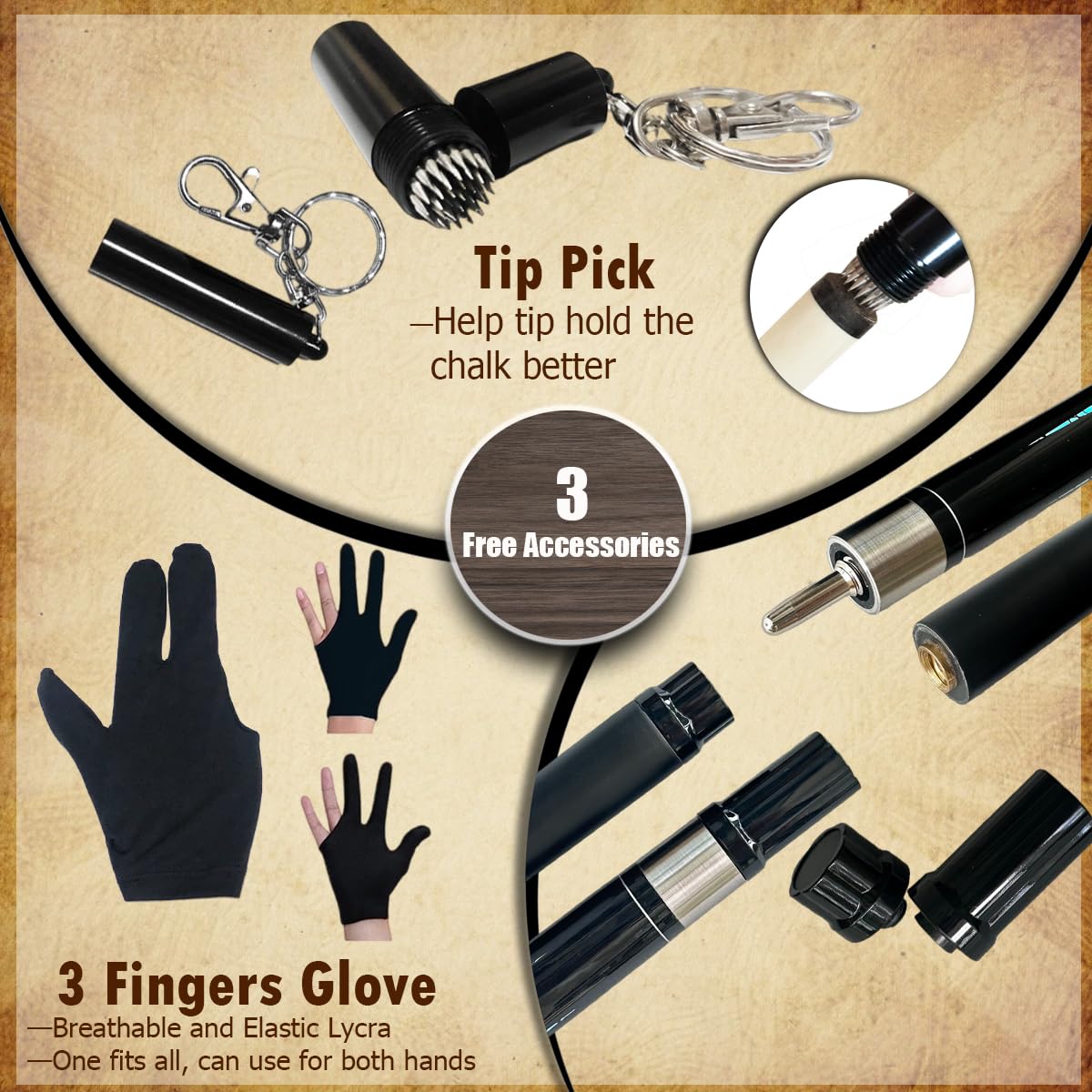 - 【All-in-One Premium Pool Set】Complete with 1 Professional Cue Stick, 1 Protective Case & 3 Essential Accessories. Perfect for Practice, Play, and Gifting. 【Specifications】Cue Length: 58 Inches (Tournament Standard); Tip: 13mm Multi-Layered Leather Tip for Enhanced Grip and Spin