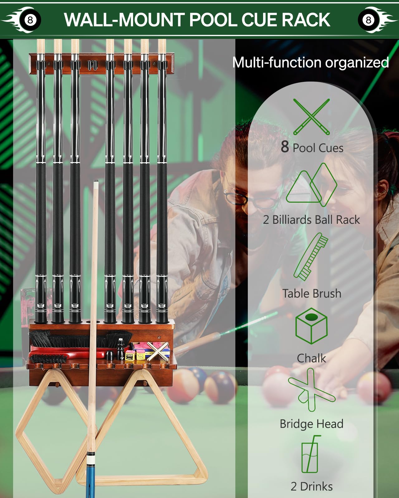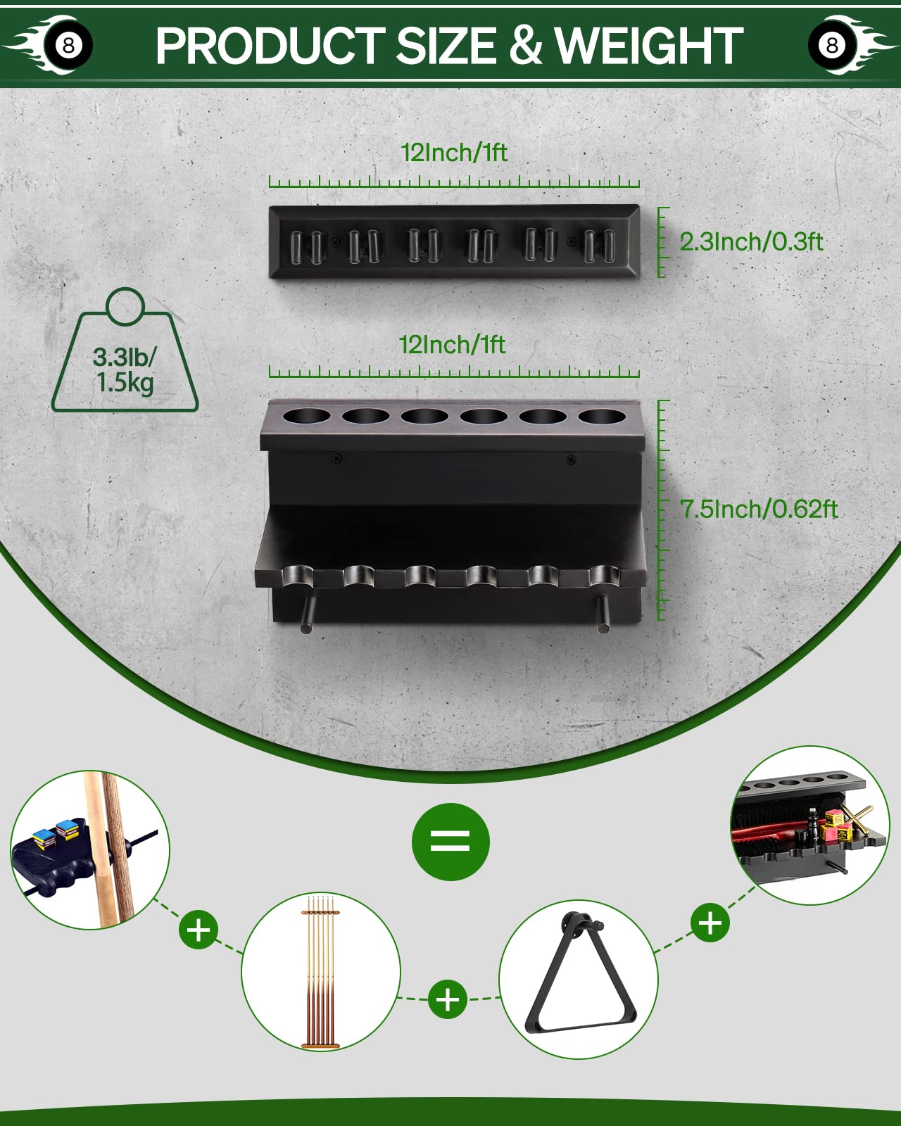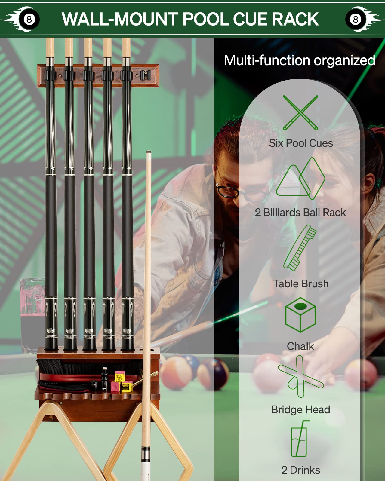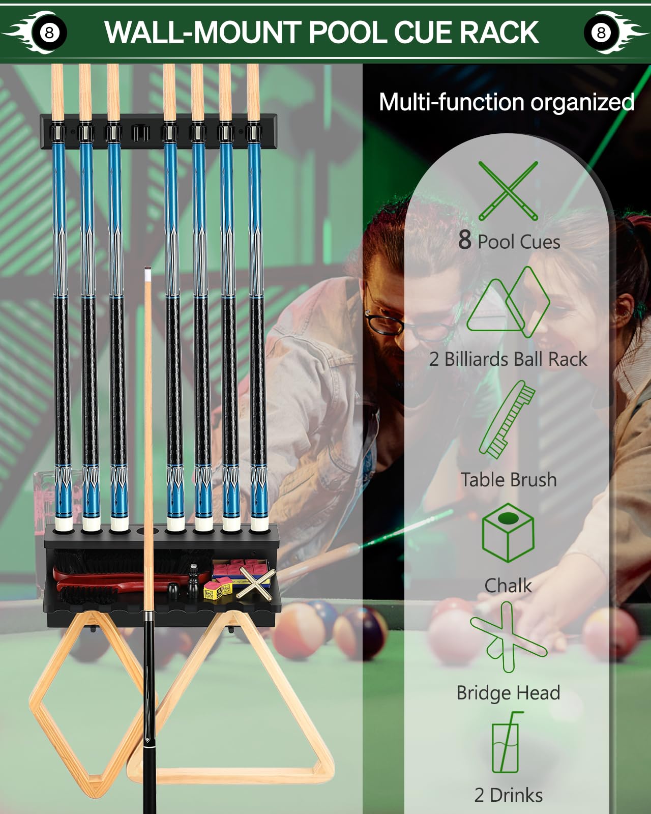 - Keep Your Game Room Tidy - Our wall mount pool cue rack is the perfect solution to organize your game room. It not only holds your pool cues but also provides additional storage for pool table accessories like chalk, brushed, and more.
